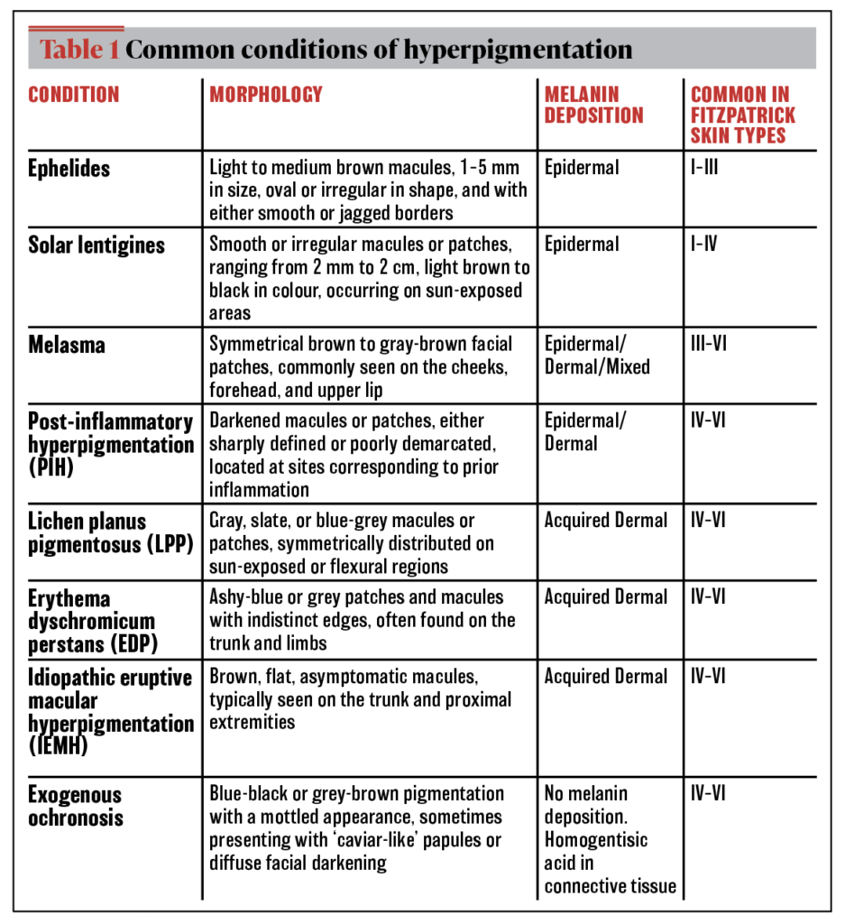 Skin colour depends on the amount and distribution of melanin, a complex polymer and pigment produced by melanocytes1–3. Melanin is also a skin chromophore, contributing to colour perception by absorbing and reflecting light2. Cutaneous hyperpigmentation can result from increased melanin production, a higher density of active melanocytes, or deposition of exogenous substances1–3. Various internal and external factors can contribute to hyperpigmentation, which explains why treatment favours a multimodal approach that incorporates both preventative measures and active interventions.