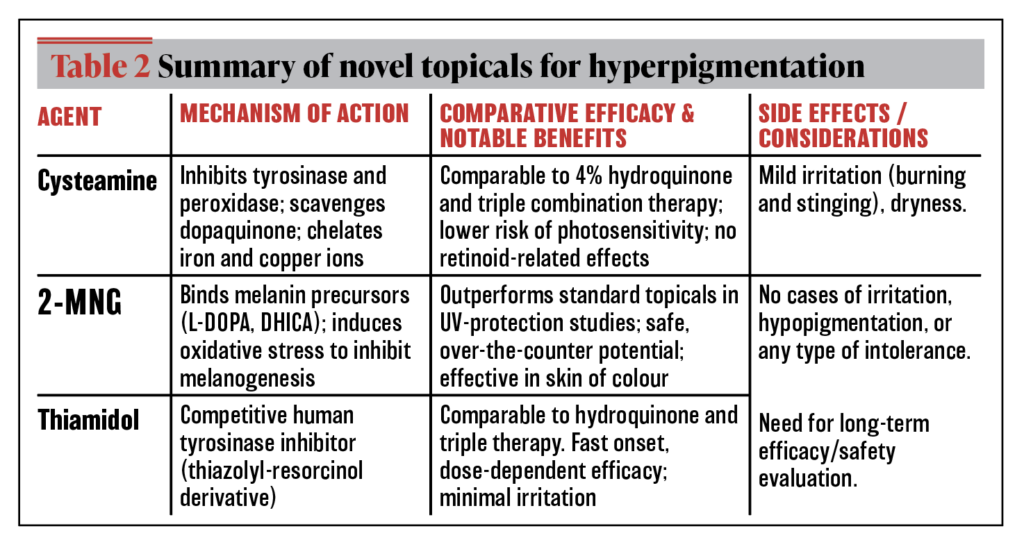 As hyperpigmentation continues to impact quality of life worldwide, emerging topicals such as cysteamine, 2-MNG and thiamidol offer promising, evidence-based alternatives to traditional therapies