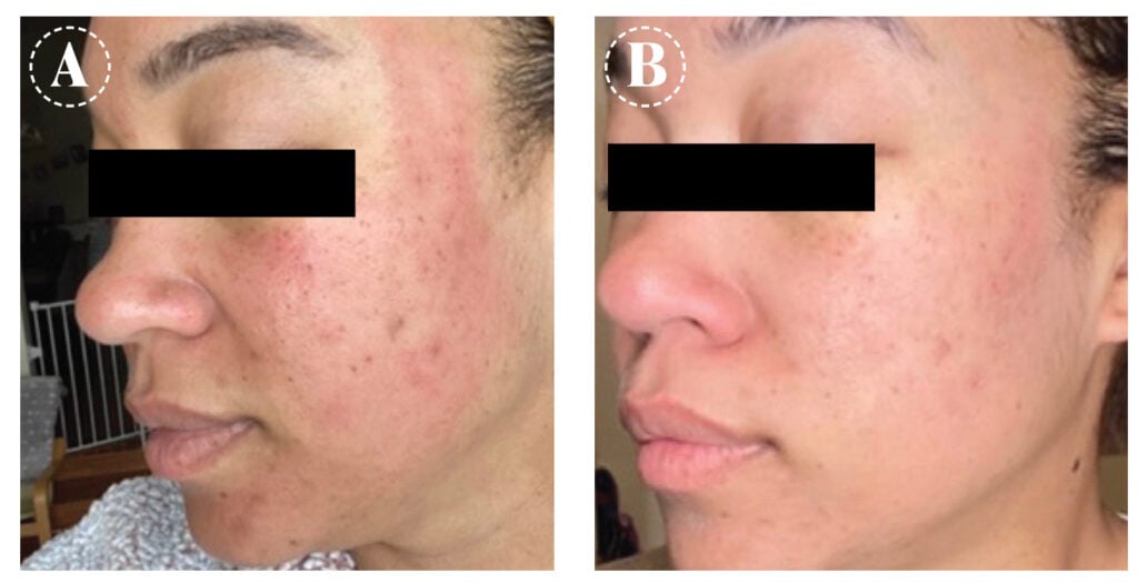 (A) Before and (B) 1 week after one treatment with micro-channelling, brightening boosters and PDRN plus 1470 nm laser biomodulation.