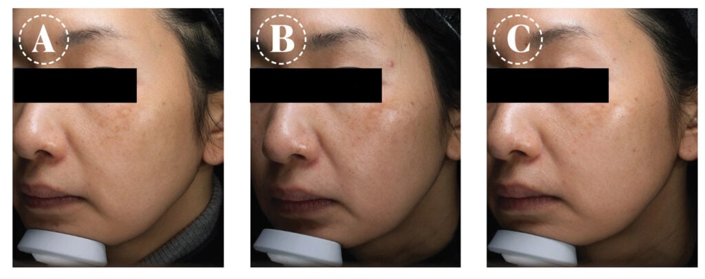 (A) Before and (B) after seeking treatment for melasma with laser therapy. The overall skin tone brightened but the reticular brown pigmentation worsened following the laser treatments. (C) After two sessions of mesotherapy with vitamin C and Cytocare®️ using the nappage technique, the reticular brown spots remained but showed noticeable improvement, along with enhanced skin texture and radiance. The patient was satisfied with the results, and the treatment was concluded. This case illustrates that energy-based devices are not always the optimal choice for treating melasma.