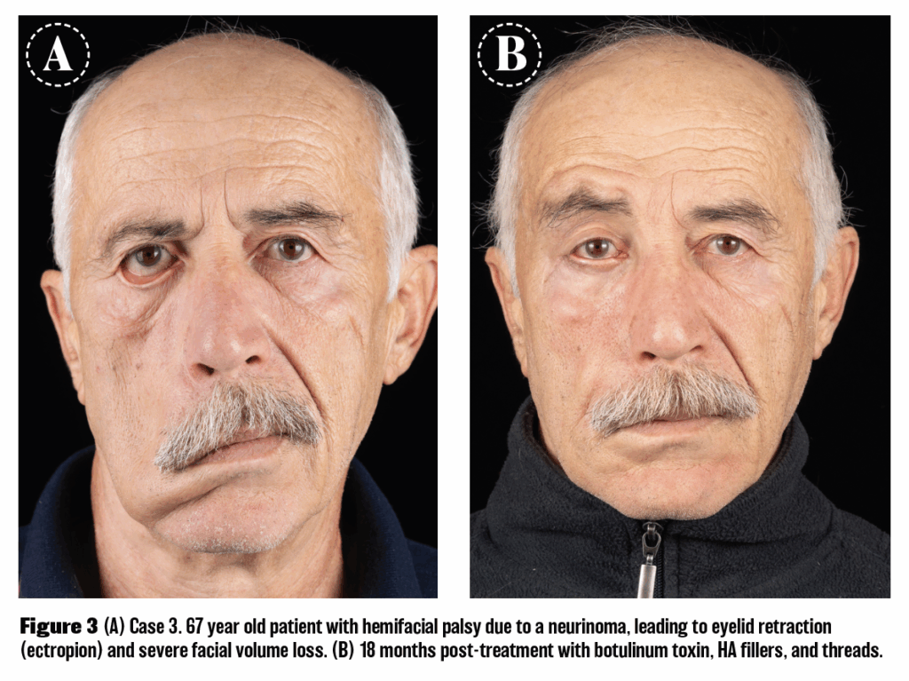 Patient: 67 years old, with hemifacial palsy due to a neurinoma, leading to eyelid retraction (ectropion) and severe facial volume loss (Figure 3A).